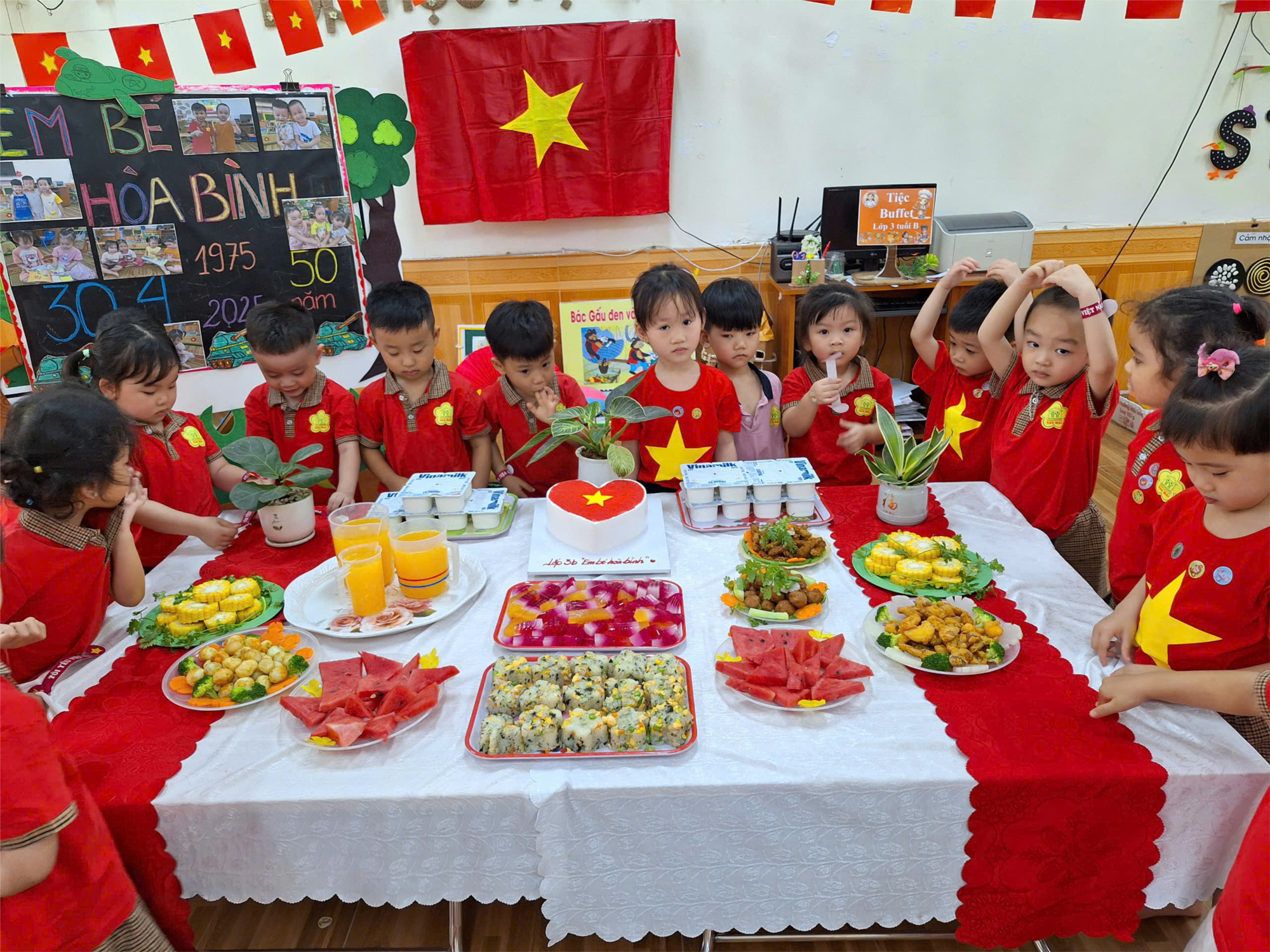 Hòa chung không khí tưng bừng cả nước, Trường Mầm non Sao Mai đã tổ chức bữa tiệc buffet vui nhộn và một số hoạt động dành cho các bé nhân dịp kỷ niệm 50 năm Giải phóng Miền Nam - Thống nhất đất nước (30/4/1975 - 30/4/2025) với Chủ đề: